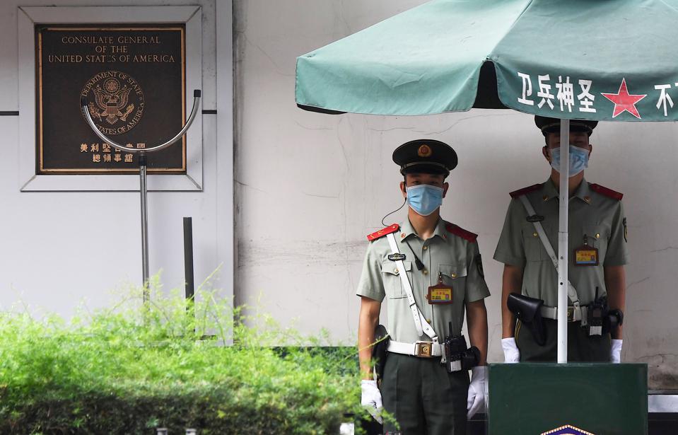 Paramilitary police stand on guard in front of the U.S. consulate in Chengdu, southwestern China's Sichuan province, on July 26, 2020. NOEL CELIS/AFP VIA GETTY IMAGES from Forbes.com